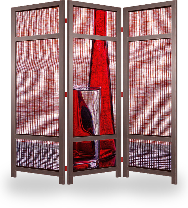 Описание ширмы "Красная бутылка" - это фотоэтюд со стеклянными предметами, необычным фоном и контровым светом. Простая минималистическая композиция, где главную роль играет свет, цвет, формы и пространственное расположение объектов съёмки