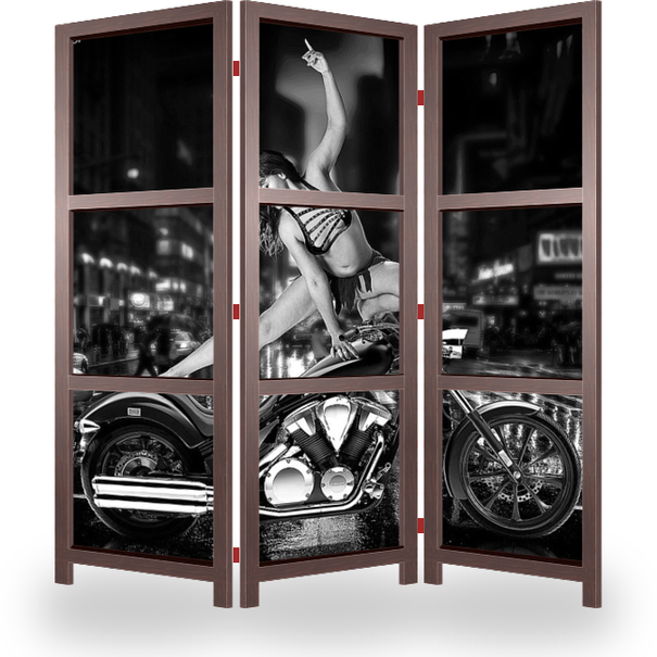 Описание ширмы Пластичность мощного, красивого мотоцикла и изящной женской фигуры, переливы линий в сочетании с черно-белой графикой, заставляют снова и снова рассматривать это прекрасное фото. А черно белое исполнение украсит абсолютно любой интерьер.