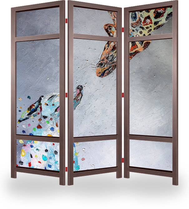 Описание ширмы Работа выполнена художником Любовью Купцовой. Оригинал картины выполнен маслом на холсте. Забавные животные. Серый задний фон.