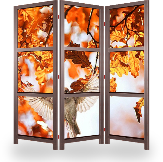 Описание ширмы птица воробей широко расправив крылья летает среди веток дуба с золотыми листьями в осеннем парке