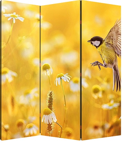 Описание ширмы маленькая птица синица летает над летним солнечным лугом с белыми ромашками
