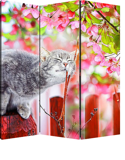 Описание ширмы милый полосатый котенок сидит на заборе в деревне под ароматными ветками яблони с розовыми цветами