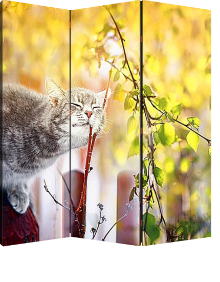 Описание ширмы милая полосатая кошка сидит в саду под ветками березы с зелеными листьями
