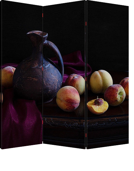 Описание ширмы Натюрморт в классическом стиле с персиками и восточным кувшином.Такой постер может украсить любое помещение вашего дома,квартиры,офиса,отеля.