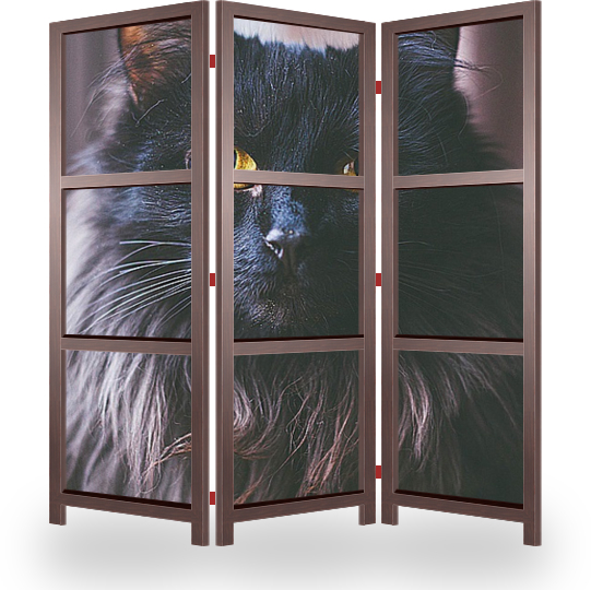 Описание ширмы Портрет черной кошки, которая сидит у окна. После того, как она поела сухой корм, на ее морде остались крошки.