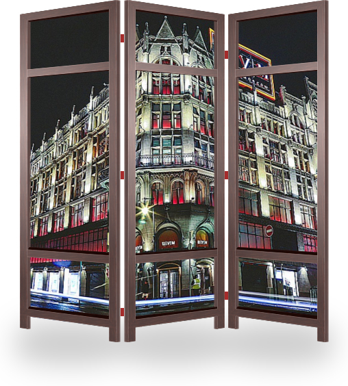 Ширма эконом отлично подойдет для временного размещения, рекламы, для отгораживания объектов интерьера и его дополнения. Лицевая сторона с изображением, обратная сторона открытый каркас
