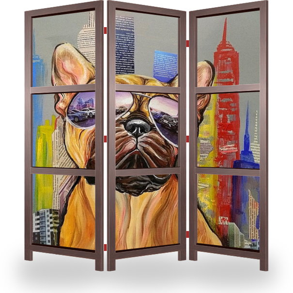 Описание ширмы картина/коллаж на холсте, использованы краски, лак, бумага. городской поп-арт, бульдог на фоне огромного города