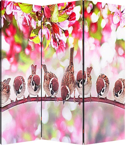 Описание ширмы панорамное фото с много маленьких забавных птиц сидят на ветке цветущей розовыми цветами яблони в майском саду