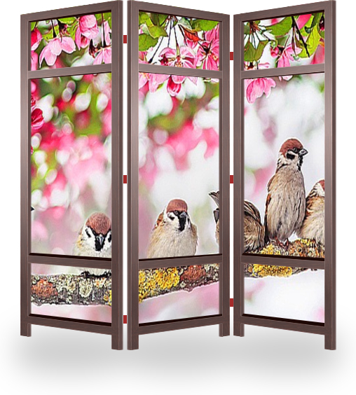 Описание ширмы панорамное фото с много маленьких забавных птиц сидят на ветке цветущей розовыми цветами яблони в майском саду