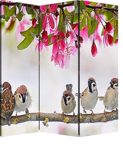Описание ширмы маленьких забавных птиц сидят на ветке цветущей розовыми цветами яблони в майском саду