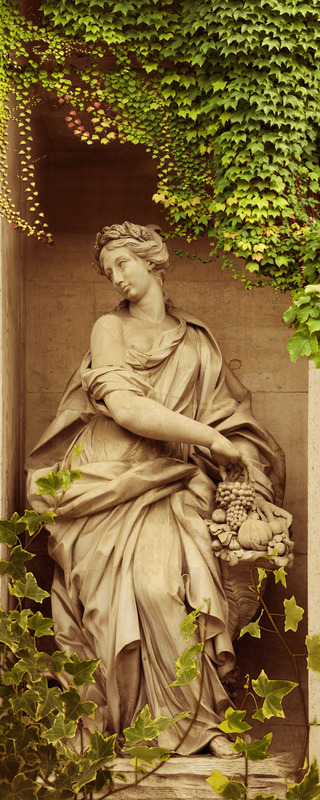 Наклейка на дверь с изображением статуи прекрасной девушки с корзинкой фруктов будет отлично смотреться на вашей кухне.