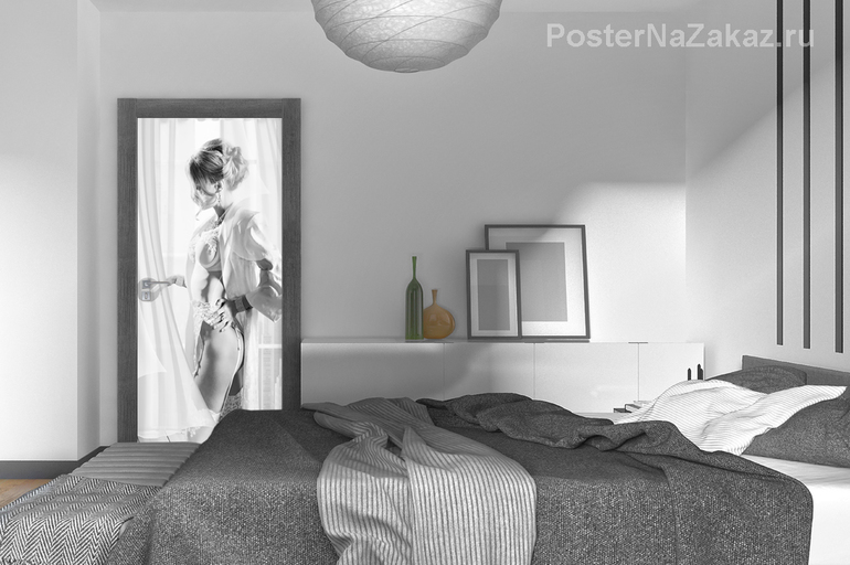 Наклейка на дверь в черно белых оттенках, с красивой фигурой девушки, прекрасно дополнит любой интерьер мужской комнаты.