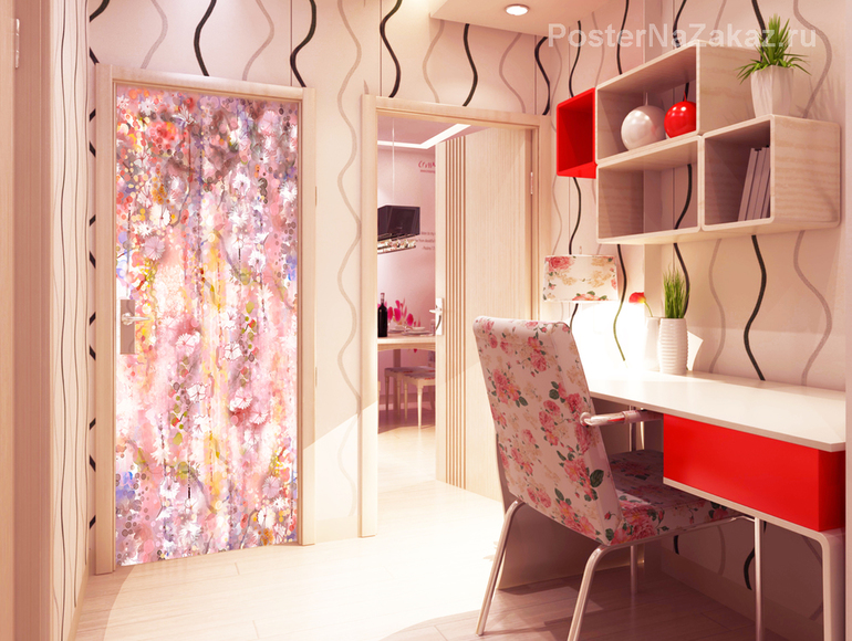 Наклейка на дверь в виде цветочной абстракции, отличное и яркое дополнение к оформлению любой женской комнаты.