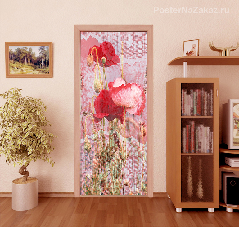 Наклейка на дверь с изображением полевых, цветущих маков,прекрасное дополнение к оформлению Вашего интерьера.