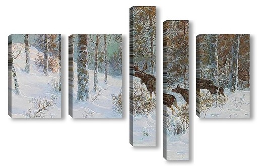 Модульная картина "Зимний пейзаж с семьей лосей"