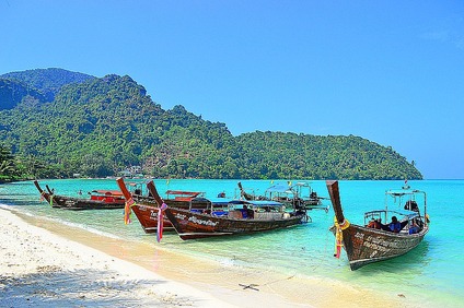 Описание модульной картины На этой фотографии изображены ярко украшенные лентами лодки, характерный для этих мест транспорт, который местные жители используют обычно для перевозки туристов с острова Пхи Пхи Дон на соседний остров Пхи Пхи Лей в бухту Майя (Таиланд), где снималс