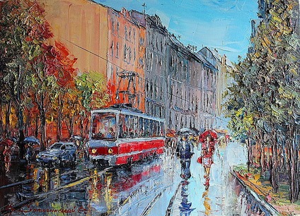 Описание модульной картины Всегда мы стыкаемся с проблемой вечной спешки суеты, все куда то торопятся, кто то хочет успеть на трамвайчик идущий в нужном направлении, кто то спешит укрыться от дождика... А вот пара изображенная на картине просто решила прогуляться, с наслажден