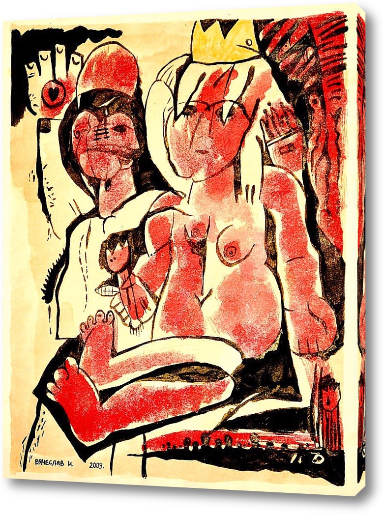 Описание модульной картины Графика тушью.Шуточное,лубочное изображение как иллюстрация к старинным народным сказкам о том как жених наконец сделал своей принцессе предложение руки и сердца...