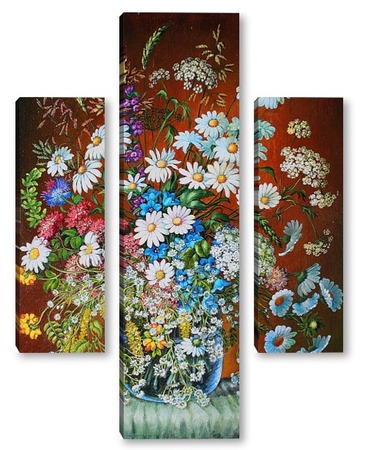Описание модульной картины Полевые цветы и травы в стеклянной вазе на светло-зелёной скатерти создают ощущение уюта комфорта. Соцветия простых и на первый взгляд невзрачных растений диких трав в сочетании с цветами, идеально гармонируют в букете. Идеально подходит как элем