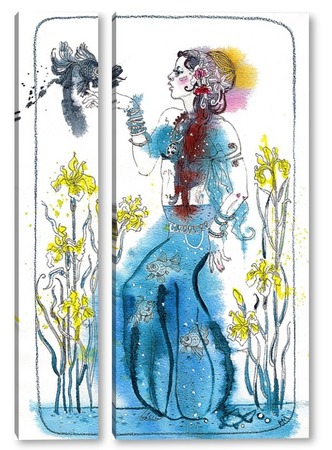 Описание модульной картины вдохновлено танцовщицей tribal fusion bellydance Миланой (Оксана Песляк) русалочка, вода, дикие ирисы, летающие рыбы тушь+акварель, художник Наталия Михальчук
