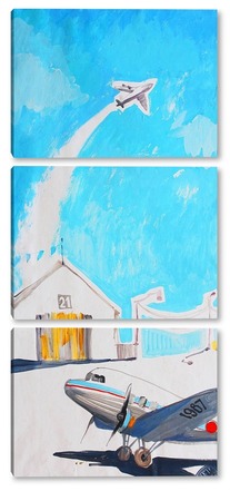 Описание модульной картины Графическая зарисовка на тему аэропорта.Из цикла работ "Технократия среды среди и в нас".Есть та часть аэропорта, которую редко кому доведется увидеть пассажирам, то места где техника после поломки вновь обретает крылья.Диптих Юнион.