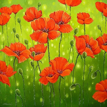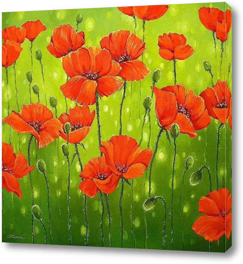 Описание модульной картины картина написана масляными красками на холсте, подрамник размером 60 х 60 см. На картине изображены алые маки на зеленом фоне. Написана картина профессиональным художником.