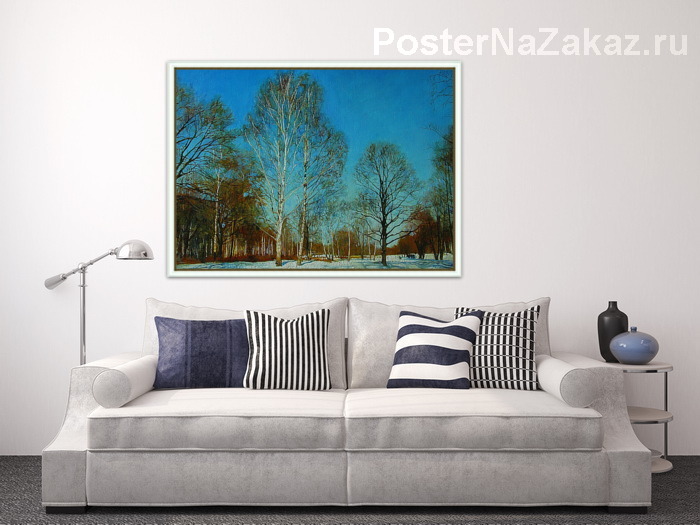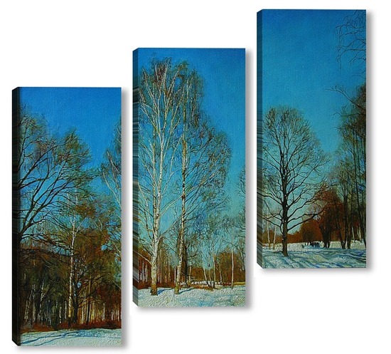 Описание модульной картины Русский зимний лирический пейзаж. Дорожка в Английском парке рядом с Петергофом проходит через красивую берёзовую рощу Зимний солнечный день ,голубое небо . синие тени на снегу всё вызывает чувства красоты , радости и гармонии с природой.