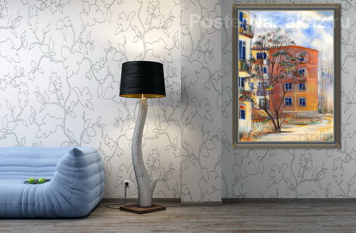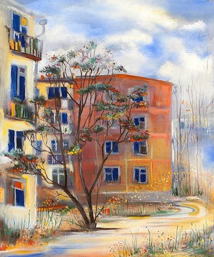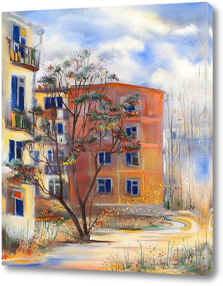 Описание модульной картины Эта картина из серии работ с домами и дворами Академгородка. Эти картины, выполненные немного в другой манере, и привлекают зрителя, туманной расплывчивостью сюжета и цветной, но прохладной перспективой.