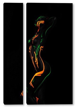 Описание модульной картины Фотография в стиле киберпанк с использованием бодиарта и постобработки. Научная фантастика воплощенная в серии снимков не оставит равнодушным ни одного ценителя киберпанка
