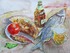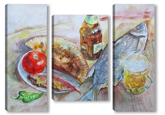 Описание модульной картины Бумага, акварель, 30х40, 2015. Работа написана в жаркий летний день. Композиционным центром является бокал пива и сушеный лещ. Акварель предназначена для интерьера кухни, паба, кафе и прочих интерьеров общественного питания.