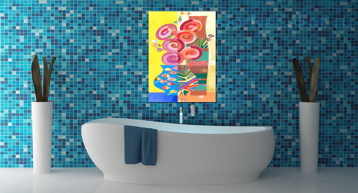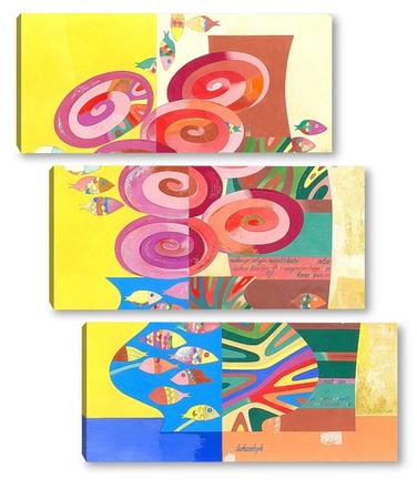 Описание модульной картины Идея натюрморта: две части с разным решением. Цветовая гамма очень большая. Через всю тему плывут сказочные рыбки в разных направлениях где-то неожиданно прячась.