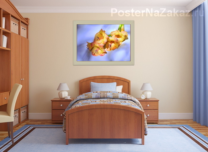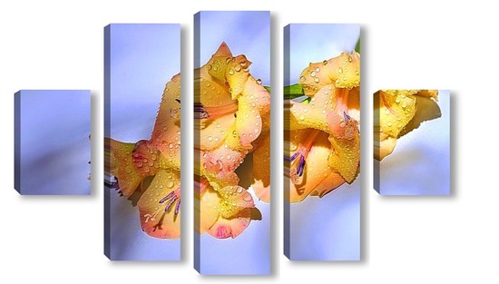 Описание модульной картины Красивый желтый гладиолус в капельках воды в луче света - выглядит как драгоценность, ощущение свежести, чистоты и красоты...