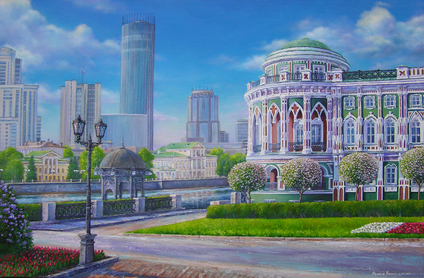 Описание модульной картины Написал дом Севастьянова с видом на высотки Екатеринбурга в яркий, солнечный, летний день.