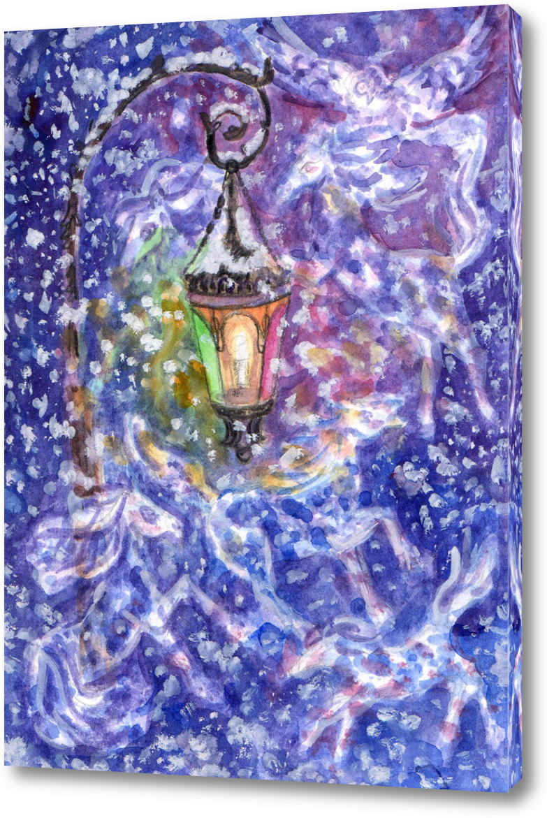 Описание модульной картины Снегопад на фоне старинного фонаря. Зимняя сказка. Зимнее фэнтези. Бумага, акварель, белила