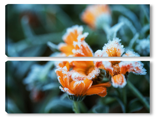 Описание модульной картины цветы календулы покрытые холодными кристаллами инея в морозное осеннее утро