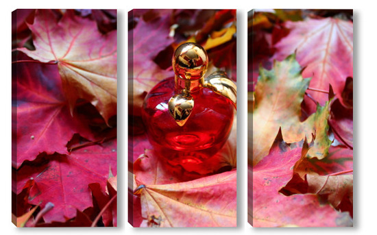 Описание модульной картины яркие, кленовые листья, покрывающие ковром землю и блестящий флакон духов-- пряный аромат осени