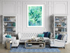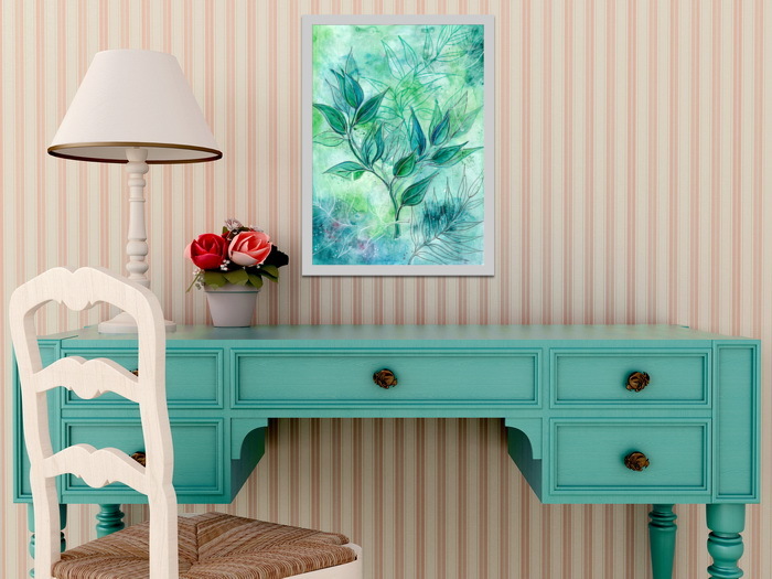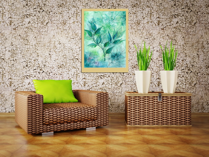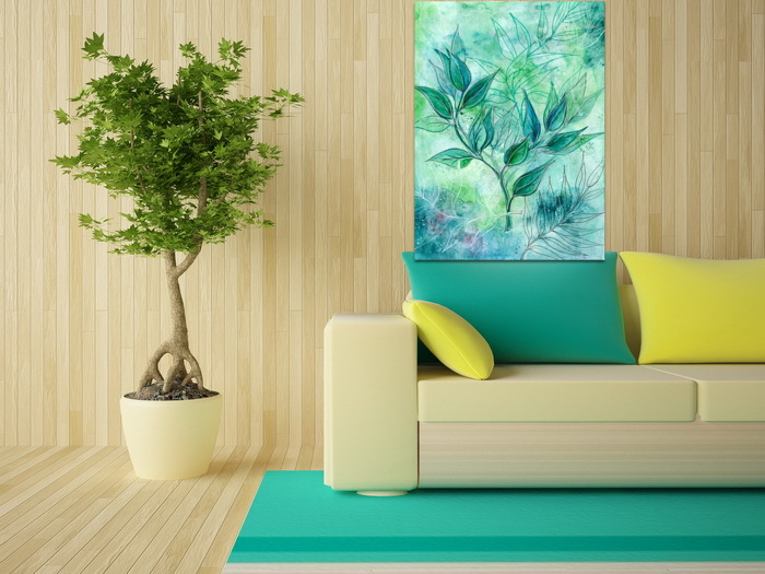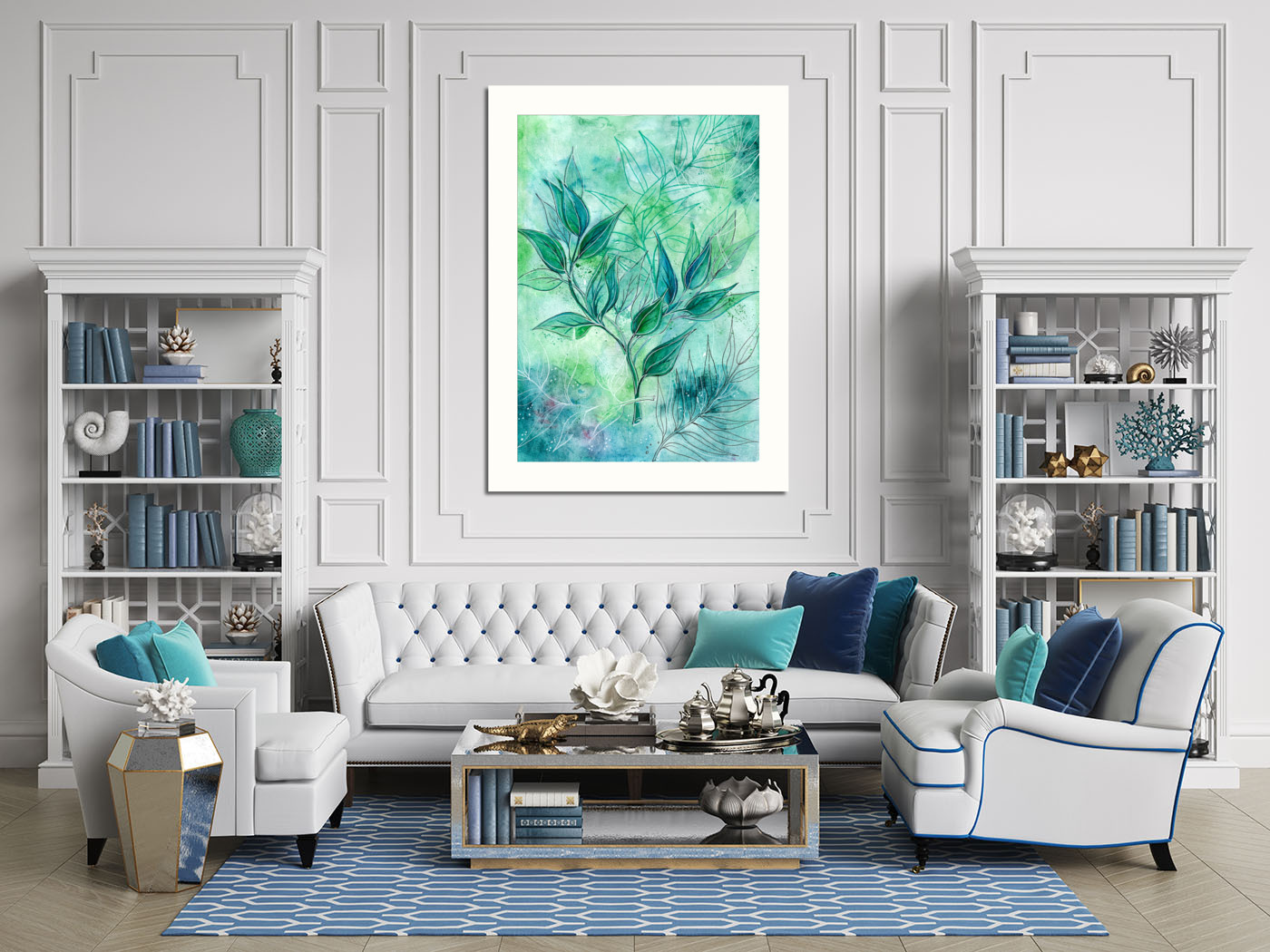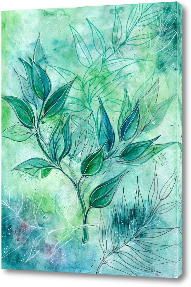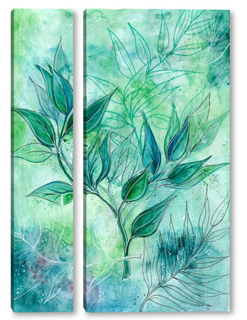 Описание модульной картины На картине полупрозрачные сине-зелёные листья, на их фоне и сзади есть прозрачные листья, которые символизируют непроявленный потенциал, который может случиться, но еще не случился.
