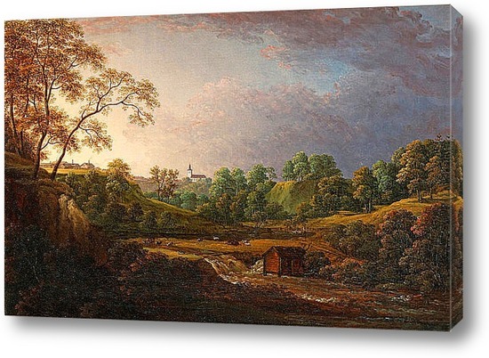 Картина "Обширный пейзаж с водопадом, домашним скотом и церковью в фоново"