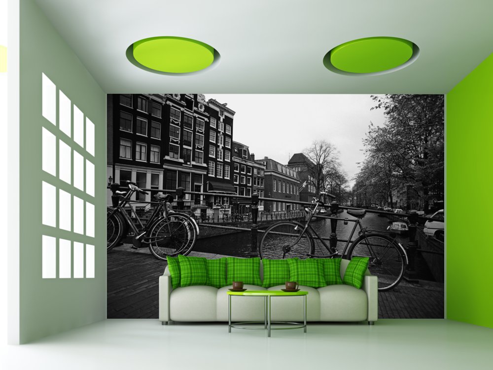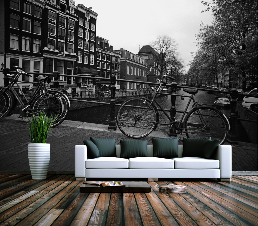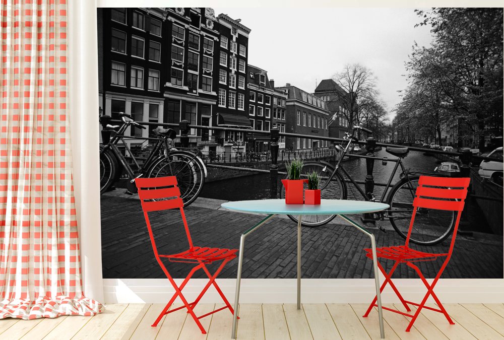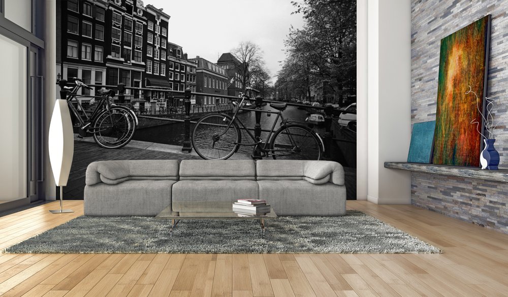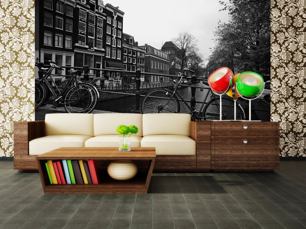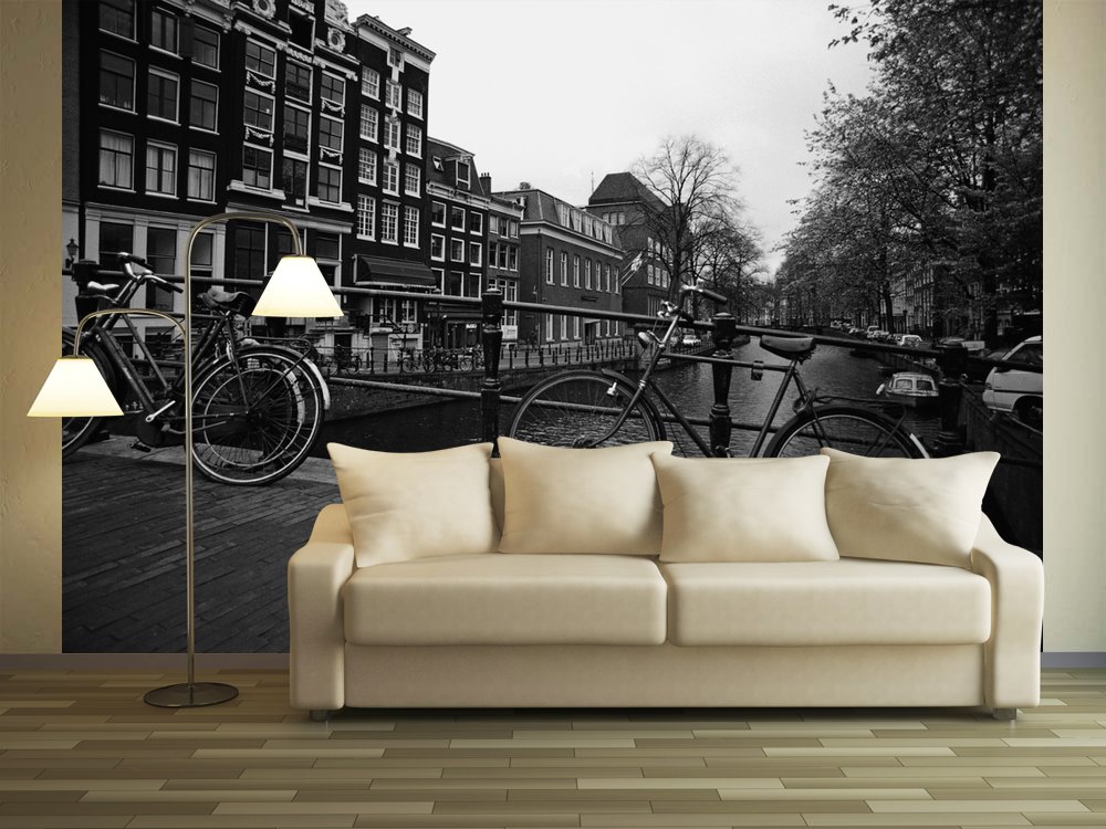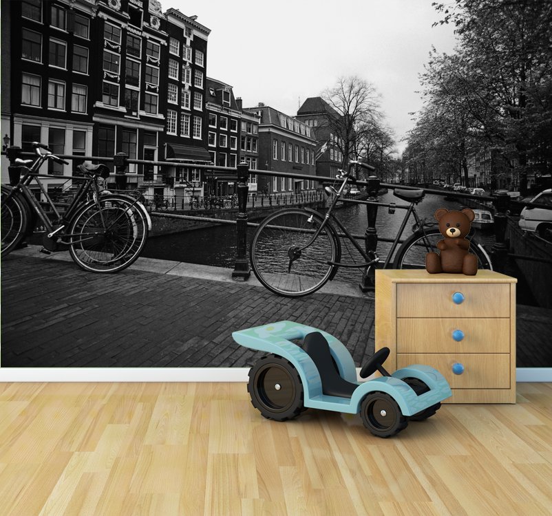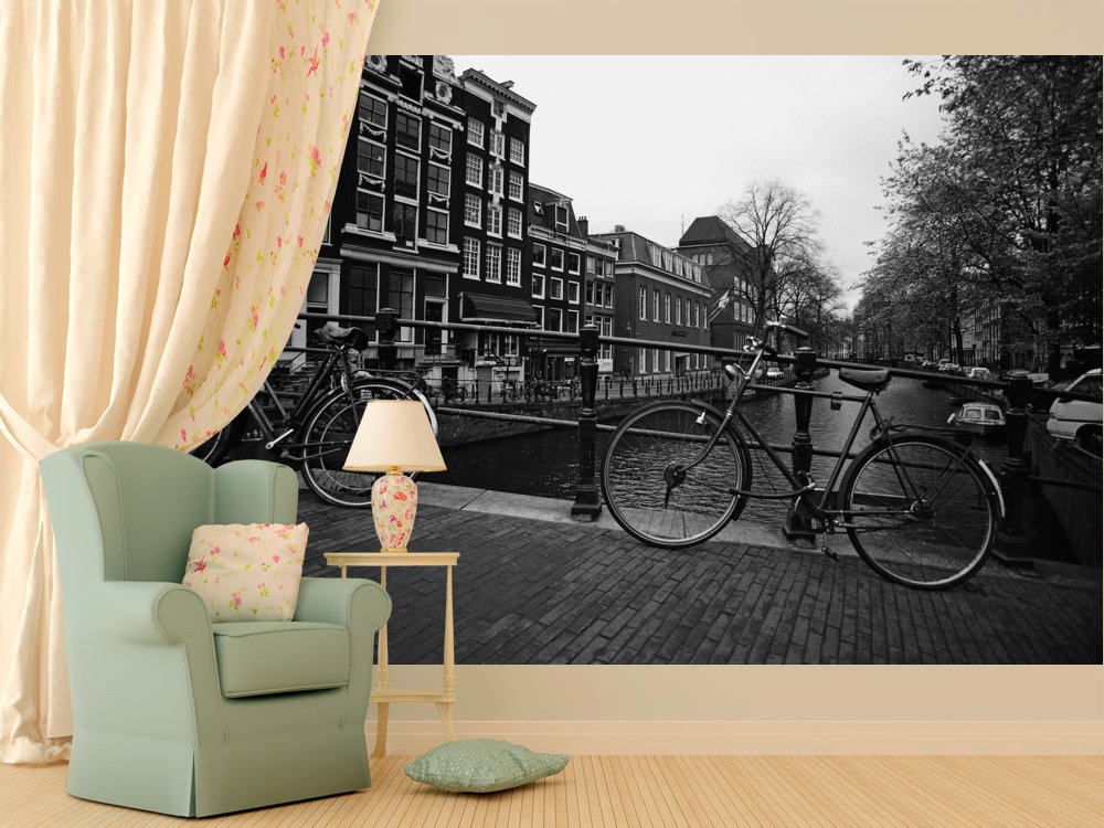 Фотообои "Велосипеды на стоянке у моста через реку"