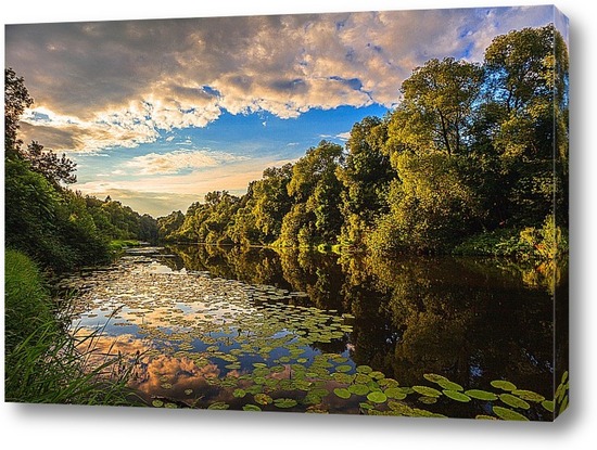 Картина "Красивый летний вид на реку при вечернем заходящем солнце"