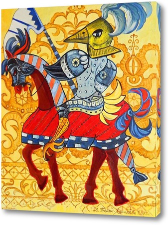 Описание картины Картина "Рыцарь" - это символическое изображение петуха-птицы в виде рыцаря. Сказочно-сюрреалистическое изображение выполнено в технике: холст, масло, размер 95х80 см.Картина участвовала в различных всероссийских выставках Омск, Москва, Уфа).