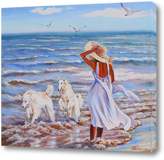 Описание картины Морской пейзаж, романтический сюжет картины наполнен солнцем, ожиданием счастливого момента в жизни девушки, игривостью настроения собак бегущих по воде, они как друзья всегда рядом. Южный ветер приятно обнимает тело, теплый прибой ласкает ножки, все