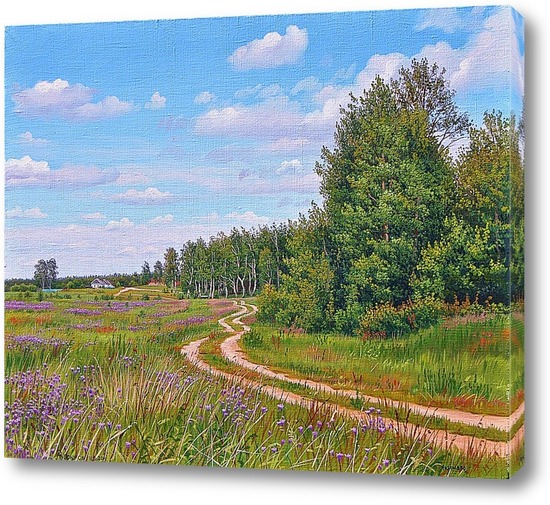 Описание картины Летний вид у деревни Якимово Кировского района Калужской области. Пейзаж сделан почти с фотографической точностью. Кто там живет - подтвердит. Ну, может, вдали некоторые детали "обобщил".