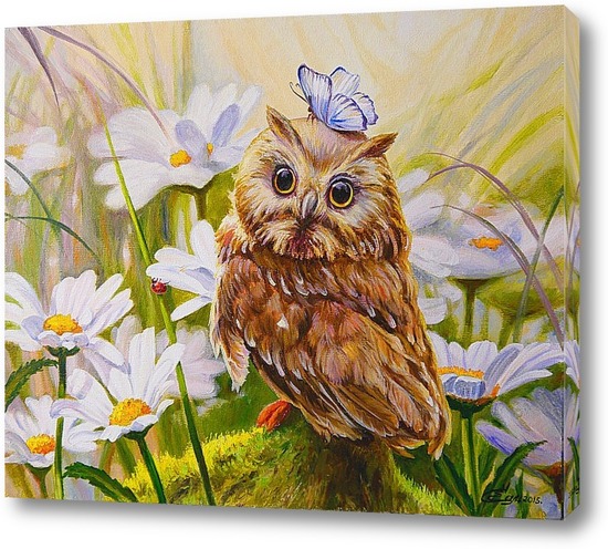 еть мир днем, да еще в таком цветущем ромашковом краю, залитом солнечным светом, ее привычный мир-ветви деревьев, а здесь на полянке мир куда привлекательней! Она слегка удивлена им, тем более что так неожиданно нашлась восхитительная подружка бабочка, так кокетливо украсившая совиную любопытную головушку. Полагаю эта картина поднимет созерцателю настроение, вызовет улыбку и оставит приятное впечатление. И пусть вам повезет!