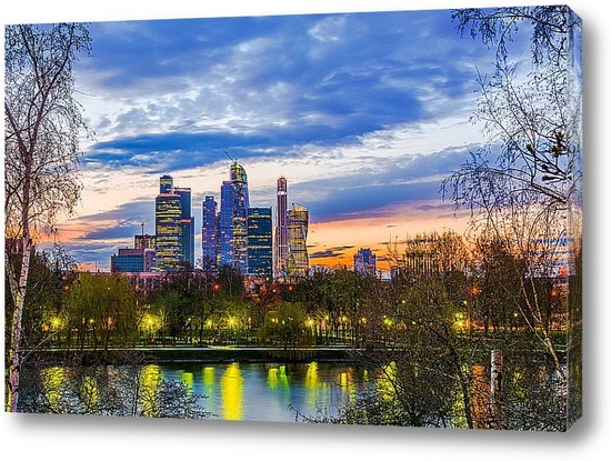 Картина "Вечерний Москва Сити и Новодевичьи пруды"