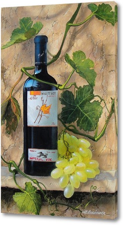 Описание картины Картина из большой серии картин "Вина Мира". На холсте изображено вино и виноград. На стене видны тени от виноградной лозы. Это вторая картина в составе триптиха, который предназначался для оформления столовой.
