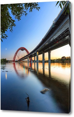 Описание картины Особенностью данного моста является его конструкция — пилон выполнен в виде арочной конструкции с веерным расположением вант, перекинутой с одного берега реки на другой, причём мост пересекает реку под острым углом. По обе стороны моста, за исключени