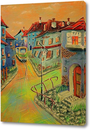 Картина "Триптих. Городок. Желто-зеленый трамвай."