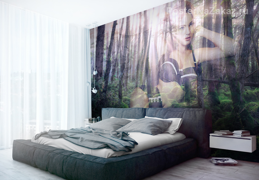 Изображение в интерьере прекрасной девушки в красивом нижнем белье на фоне леса в лучах восхода солнца украсит мужскую спальню.