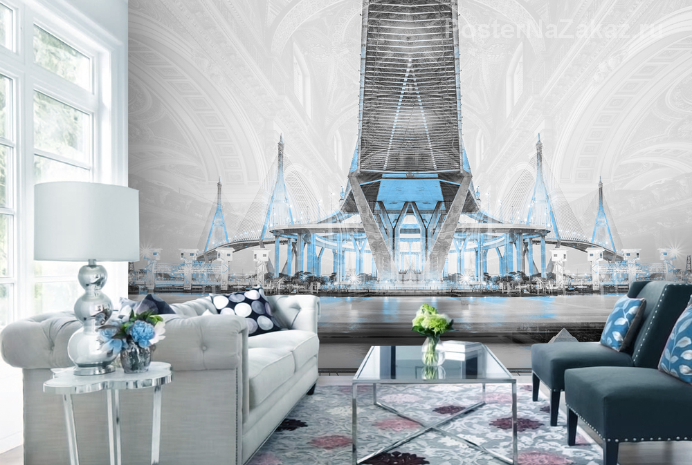 Изображение в интерьере висячего моста Пумипона шоссе через реку снизу в черно-белой цветовой гамме с яркими синими акцентами украсит вашу гостиную.